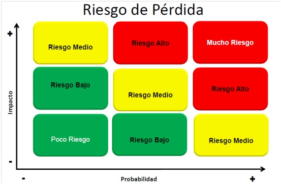 Ahora, para cada riesgo debes valorar dos cosas: la probabilidad de que suceda y el impacto que tiene en la posibilidad que el cliente se vaya si sucede. Lógicamente, antes de empezar estás estimando estos valores, así que no tiene mucho sentido asignar valores numéricos muy precisos. Es preferible usar una escala de tres valores, así: