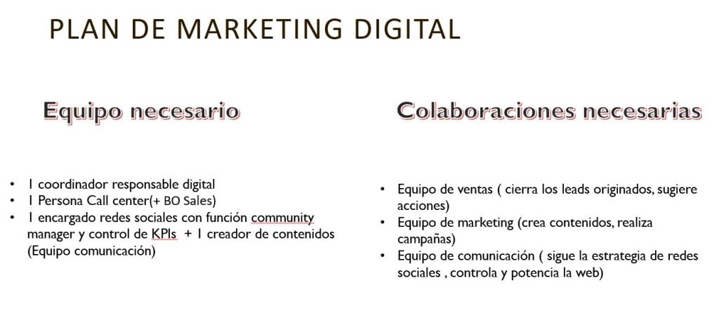 - 1 encargado redes sociales con función community manager y control de KPIs + 1 creador de contenidos (Equipo comunicación)
