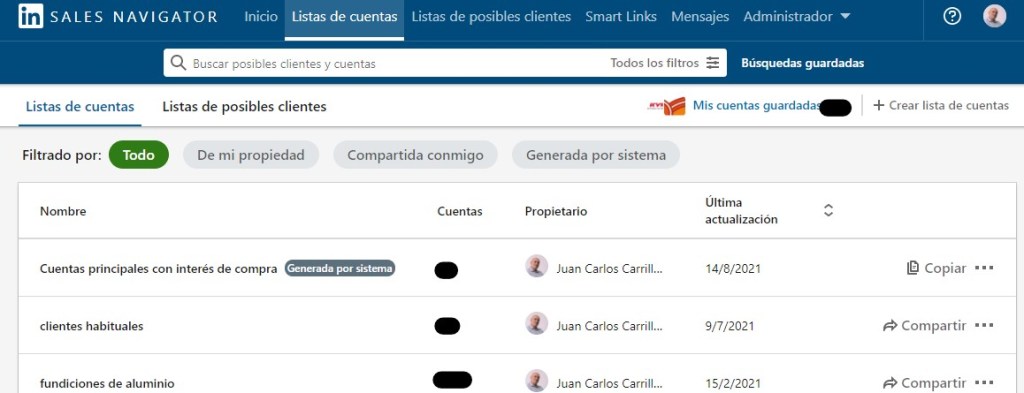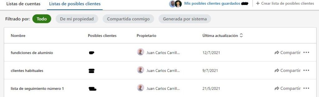 Para crear estas listas tienes un buscador con filtros para poder seleccionar lo que te interesa sugiero que empieces por las cuentas y dentro de las cuentas ya selecciones los clientes Aunque lo puedes hacer de las dos maneras. Cuando hablo de clientes hablo de personas, tienes que seleccionar la gente que te pueda comprar lo que vendes