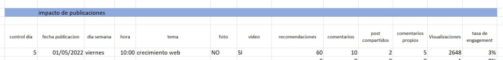 Control Día/fecha publicación, dia semana, hora, tema, foto. video, recomendaciones, comentarios, post compartidos, comentarios propios, visualizaciones, tasa de engegement